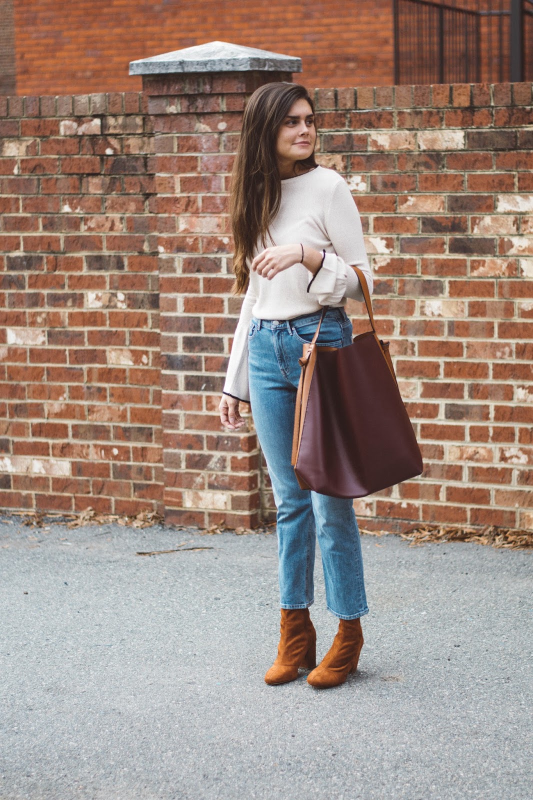 Today we're sharing a look that we know you'll live in! It's everything we want and need in an outfit: flattering, comfortable, and stylish! Bring your most basic pair of jeans to life with a top like this one. We love the bell sleeve feature almost as much as we love how cozy it is. It's a knitted top (perfect to keep you warm in these frigid temps) with the cutest black trim detail around the neckline and sleeves. If you need an added layer of warmth, try cozying up with this faux fur coat or a simple black jacket! We're still loving these suede booties and think they add just enough of a 70's vibe without being over the top!