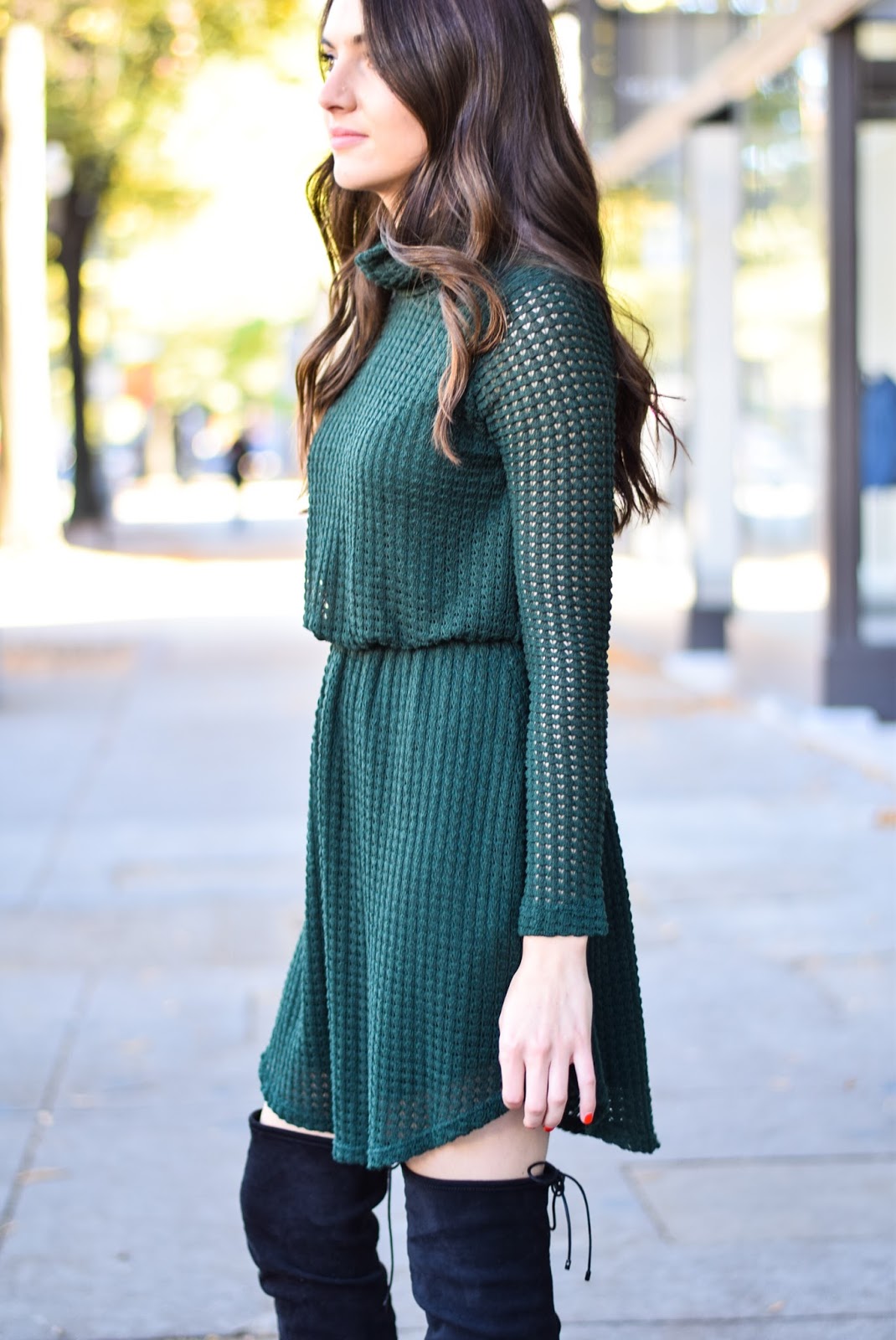 This dress has so many cute details - like the turtleneck and the semi-sheer sleeves - that take it from just a simple green dress to something more!