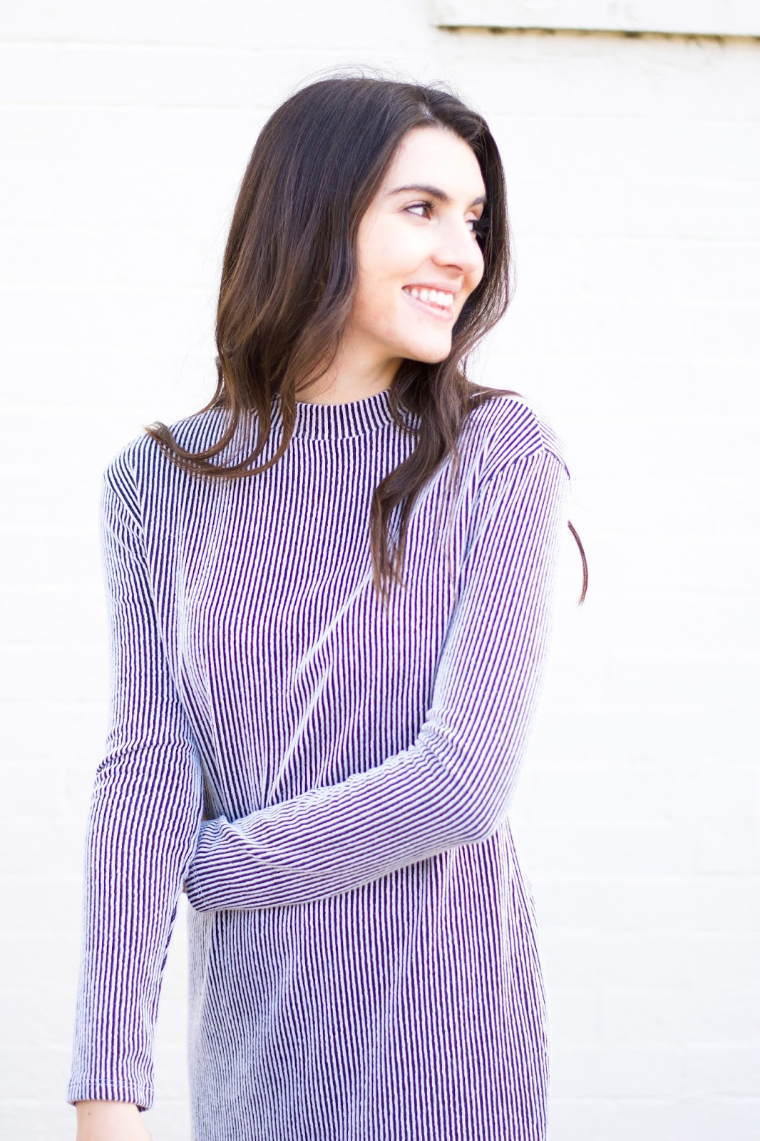 This striped dress is an updated version of your simple t-shirt dress. The long sleeves make it ideal for the colder months and the mock turtleneck adds some flair. With a soft textured pattern and a slightly looser fit, you will be reaching for this dress often.