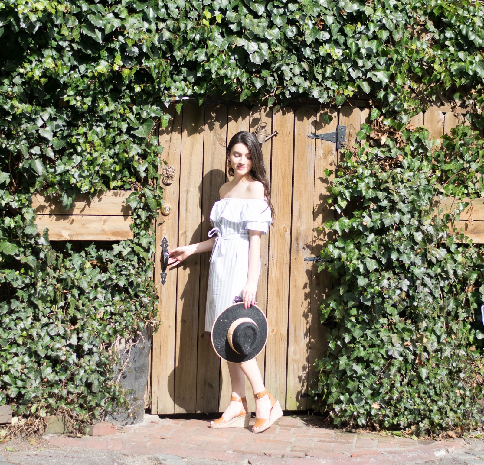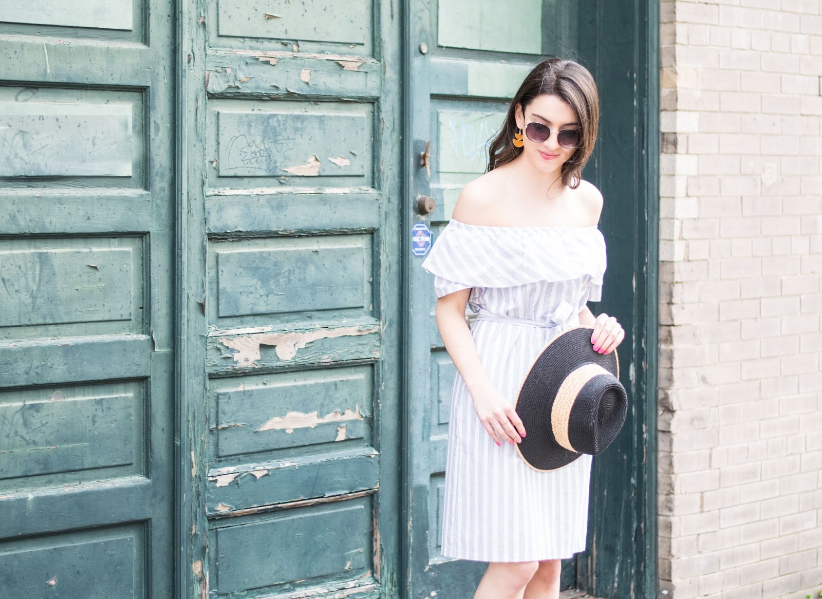 With the warm weather comes more and more social events (we're not complaining) and of course more outfits to plan! We are all about those pieces of clothing that are instant looks - like this striped off the shoulder dress! Throw it on with a pair of cute wedges and you're ready for drinks on the rooftop or diner al fresco. We're loving the simple bow tie on this dress to add a bit of definition to the otherwise shift style dress.