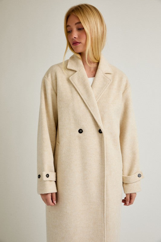This cream lapel coat combines style and comfort with its relaxed, oversized fit. Button front closure and side pockets make it both practical and chic—dress it up or down for any occasion.