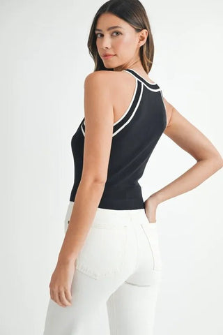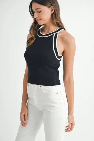 This chic and trendy tank features contrast trim and a unique Grecian neck design, perfect for a fashionable night out.