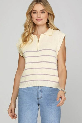 She + Sky Ribbed Hem Striped Half Zip Sweater Vest